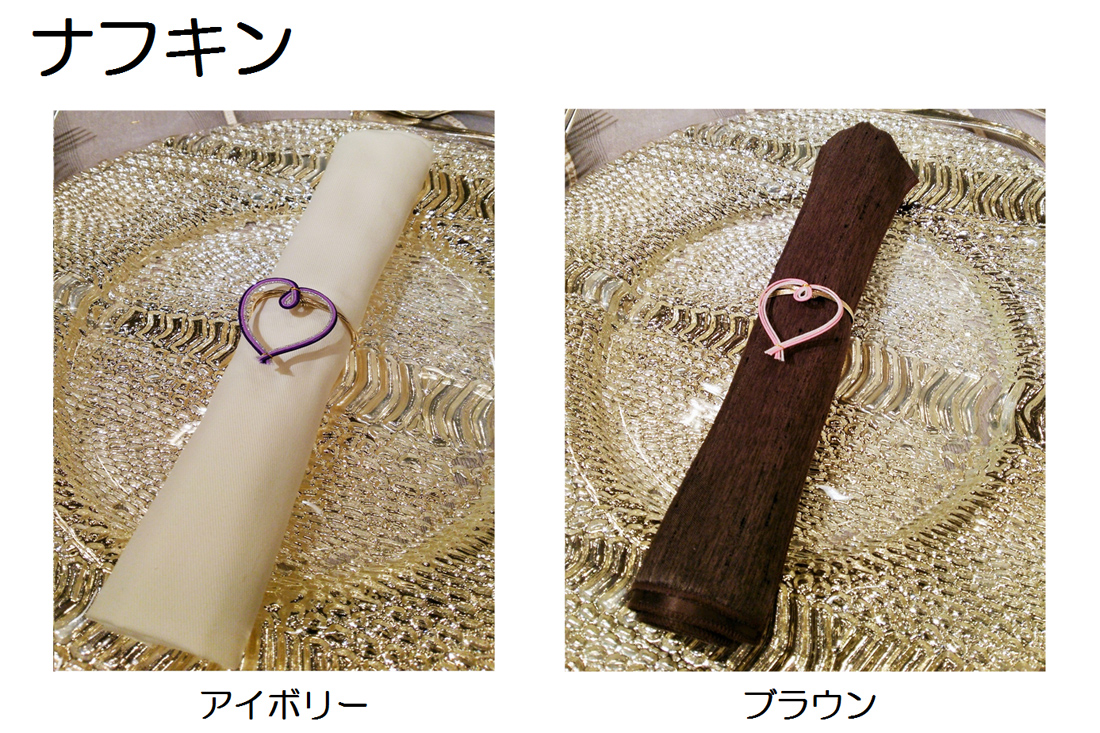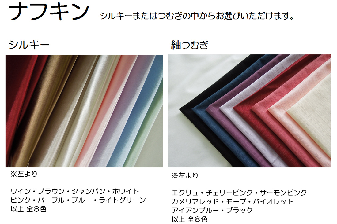 ※ナフキンは、シルキー(カラー全8色:ワイン・ブラウン・シャンパン・ホワイト・ピンク・パープル・ブルー・ライトグリーン)