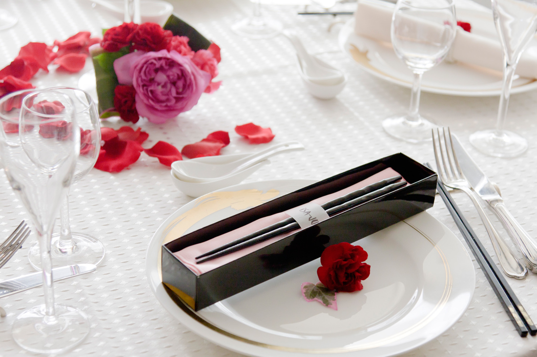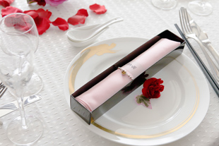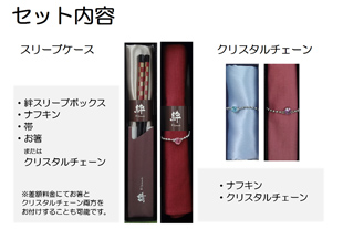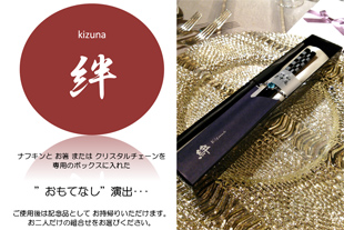 ナフキンとお箸または、クリスタルチェーンを専用のボックスに入れた「おもてなし」演出ご使用後は記念品としてお持帰りいただけます。